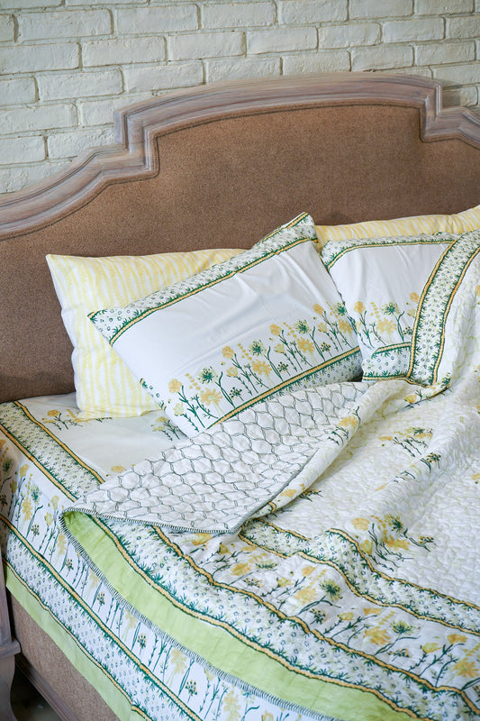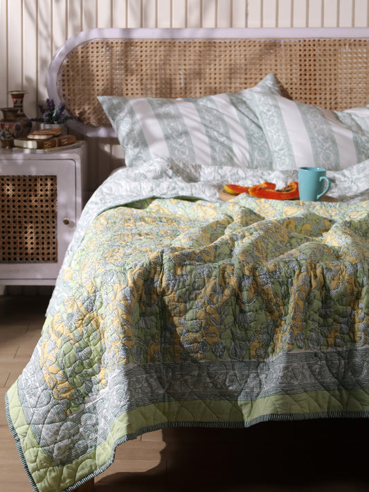 Green and yellow motif tiles mulmul quilt