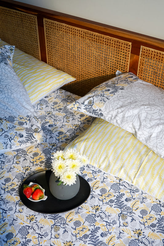 Blue grey and yellow kamal phool bedsheet set (floral jaal)