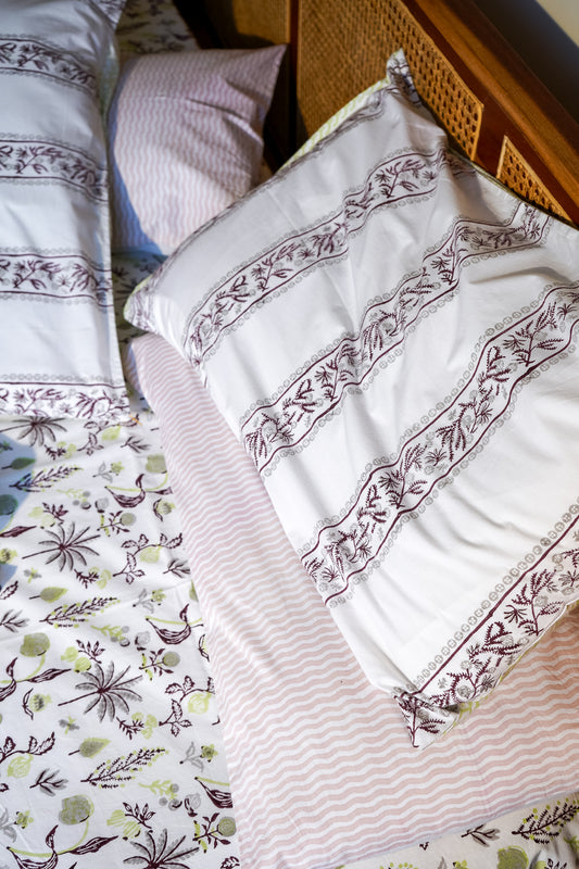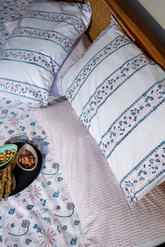 Pink blue and grey nariyal tree bedsheet set (scattered floral)