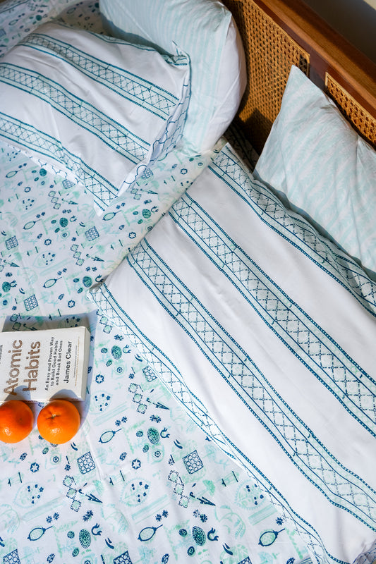 Turquoise and blue 2 colour matching motif bedsheet set
