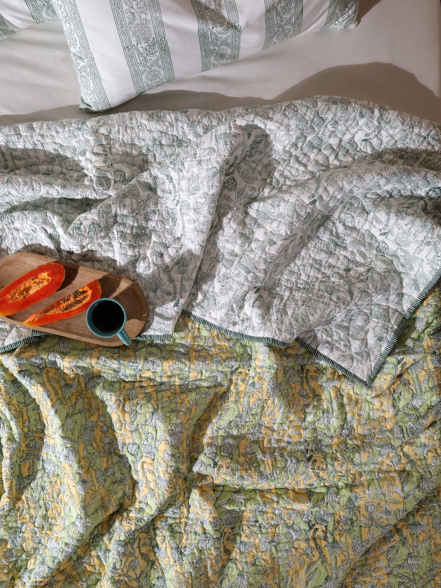 Green and yellow jharokha motif mulmul quilt