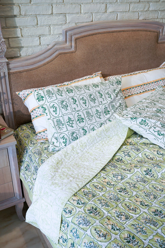 Green and yellow motif tiles mulmul quilt