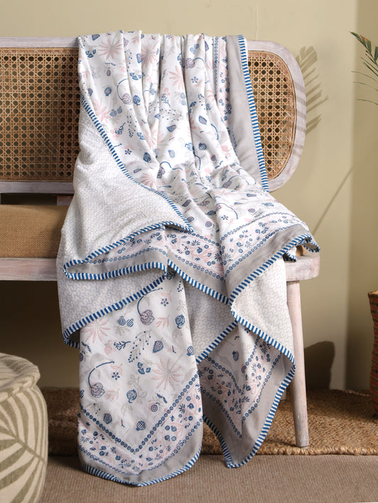 Pink blue and grey nariyal tree mulmul dohar (scattered floral)