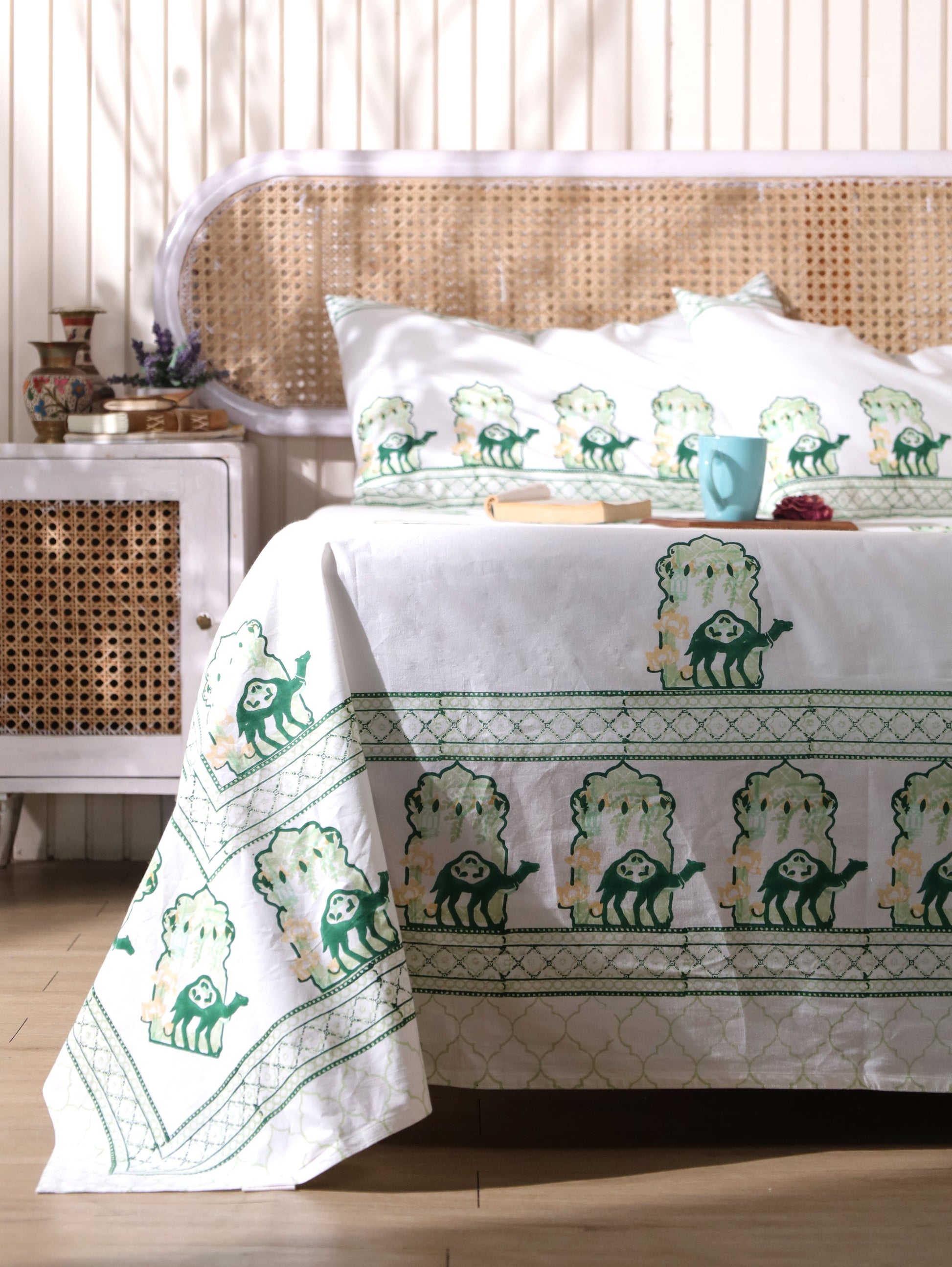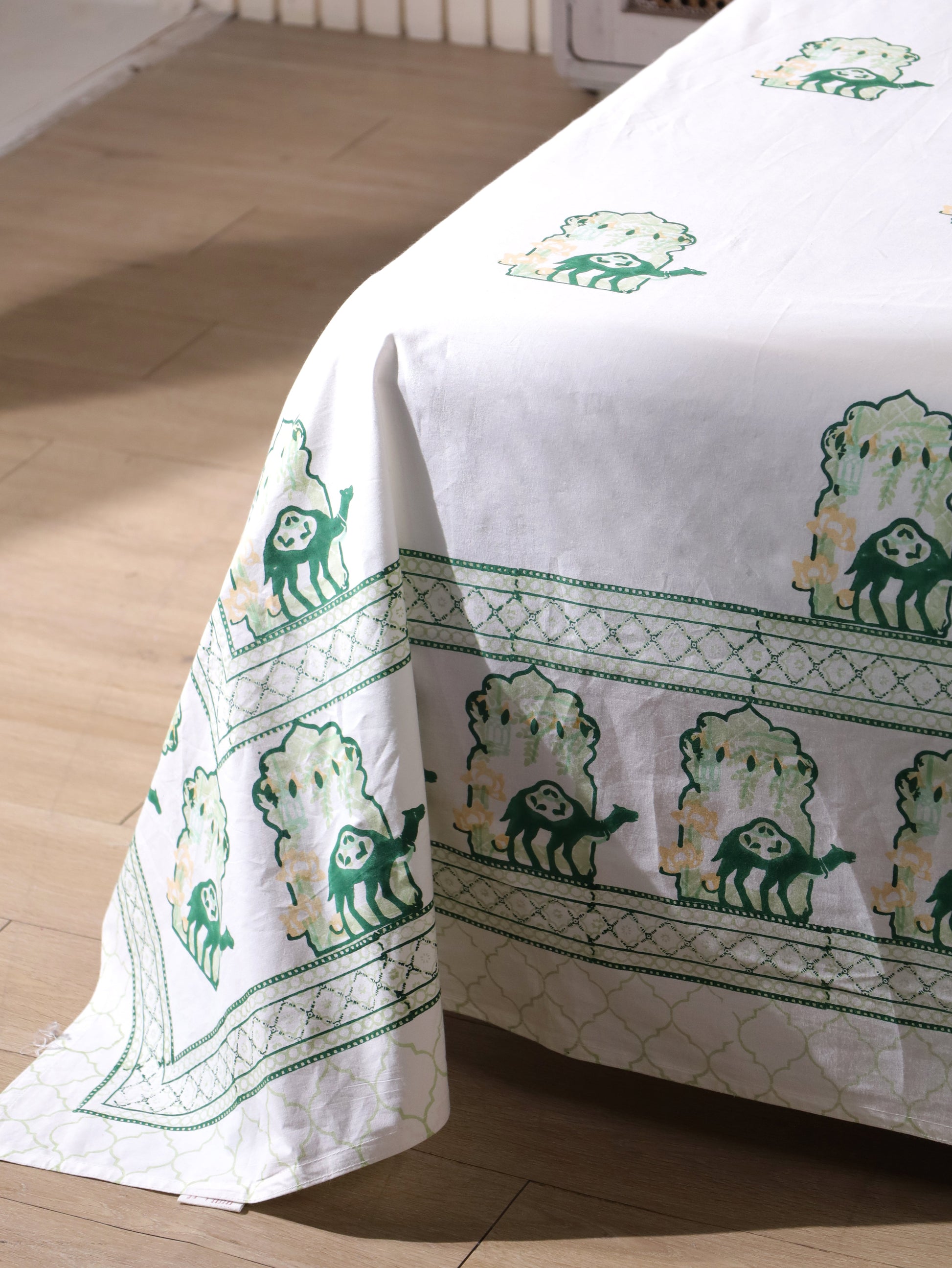 Green and yellow jharokha motif fitted bedsheet set
