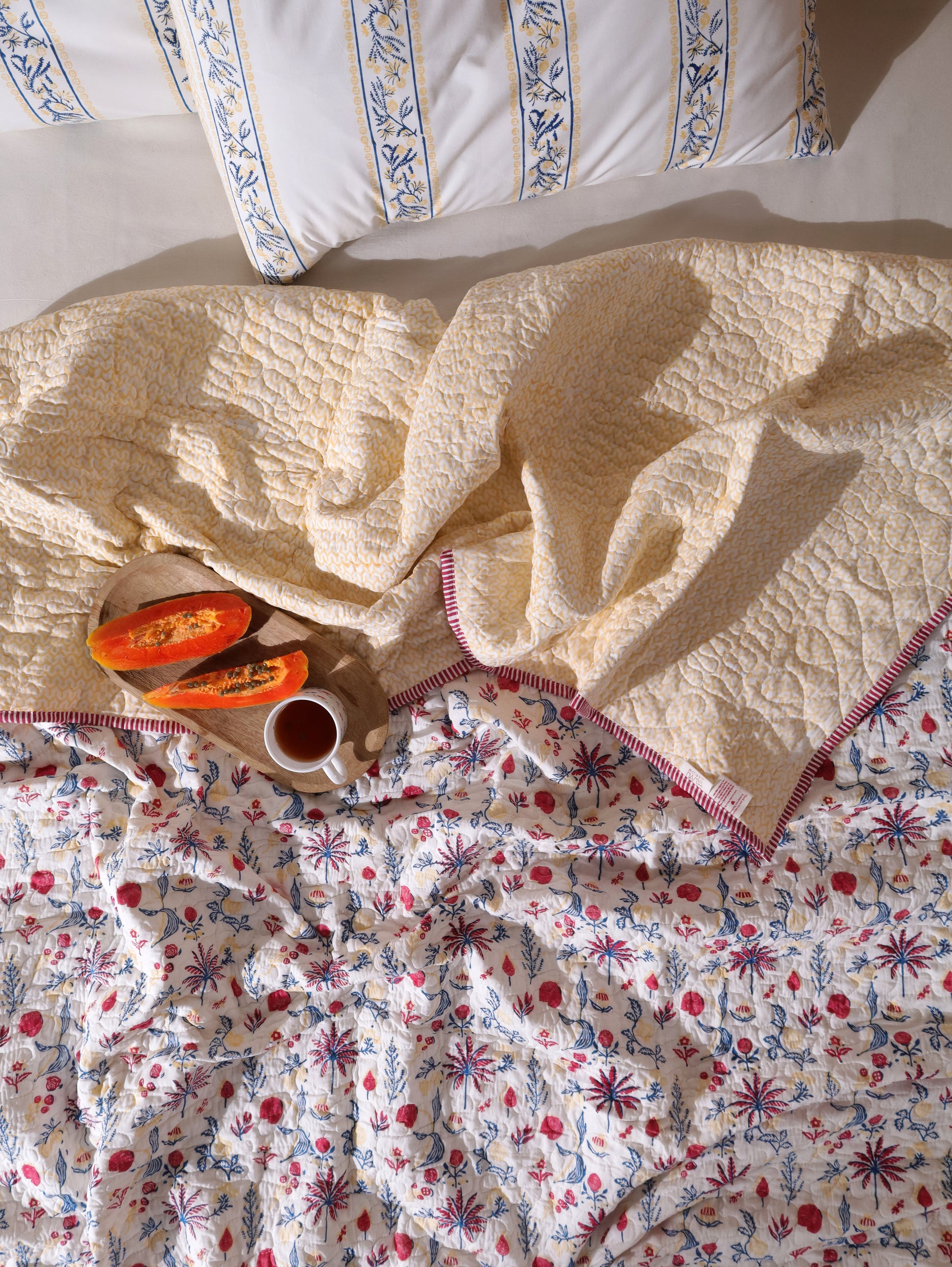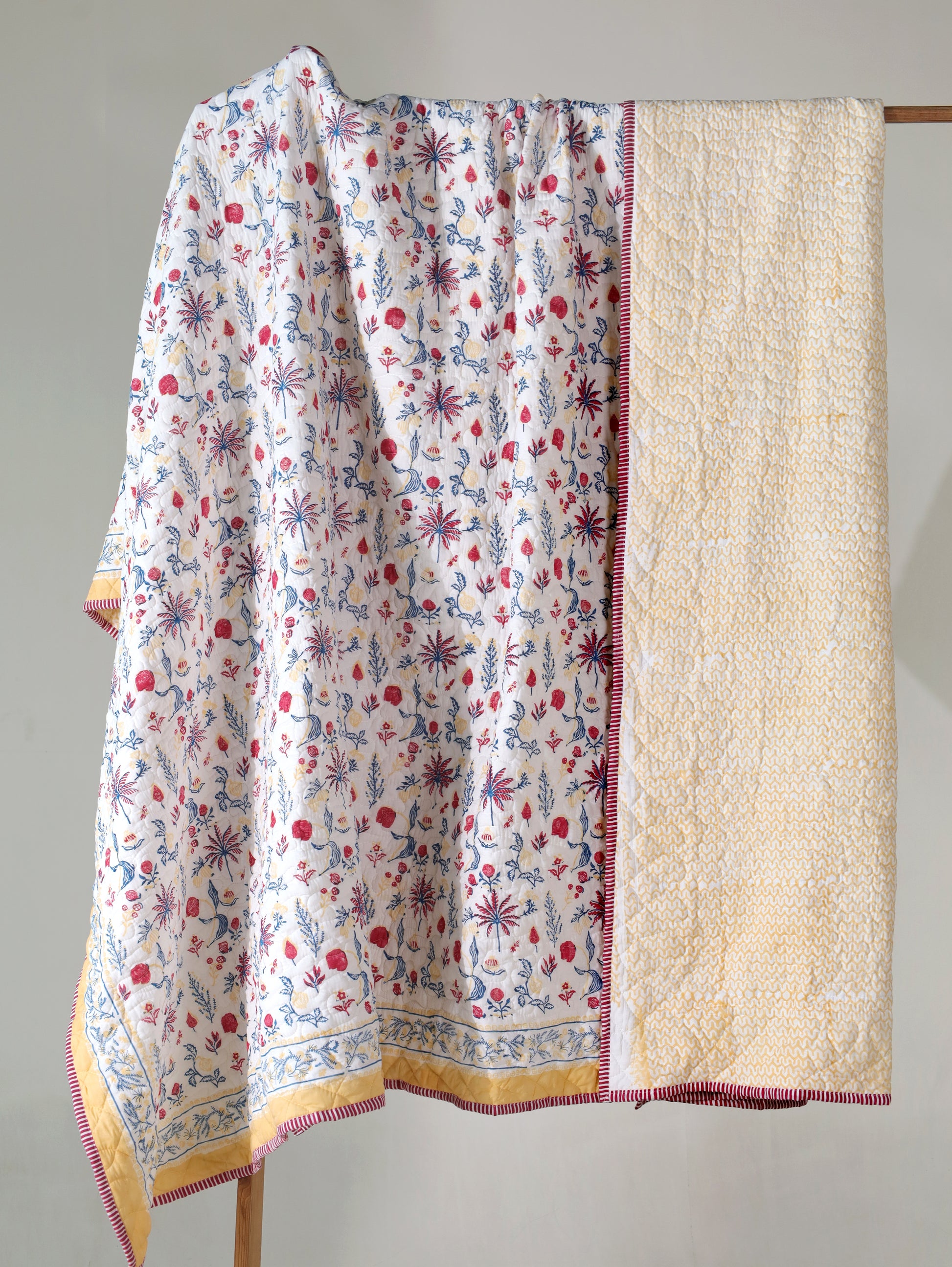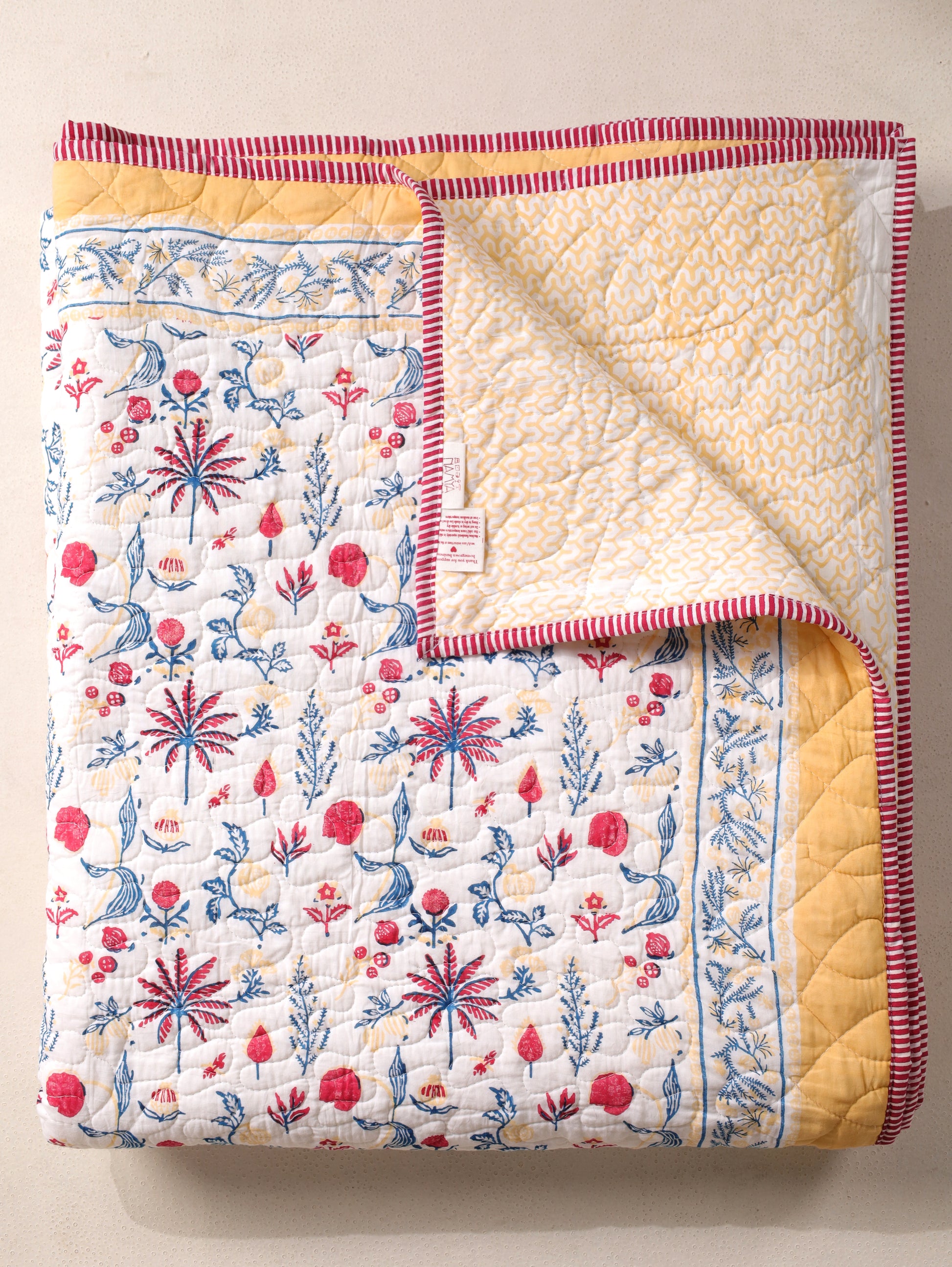 Magenta yellow and blue nariyal tree mulmul quilt (scattered floral)