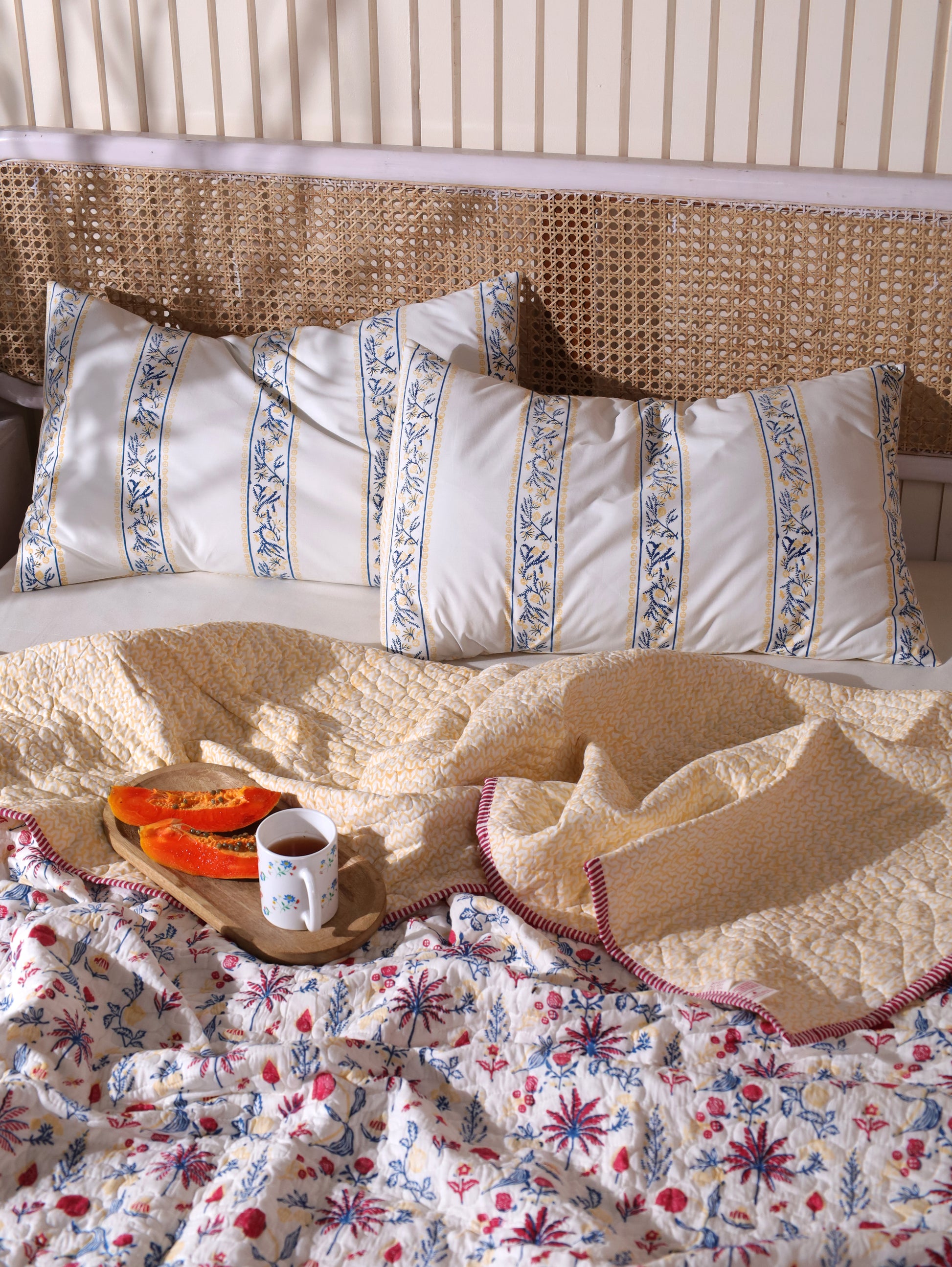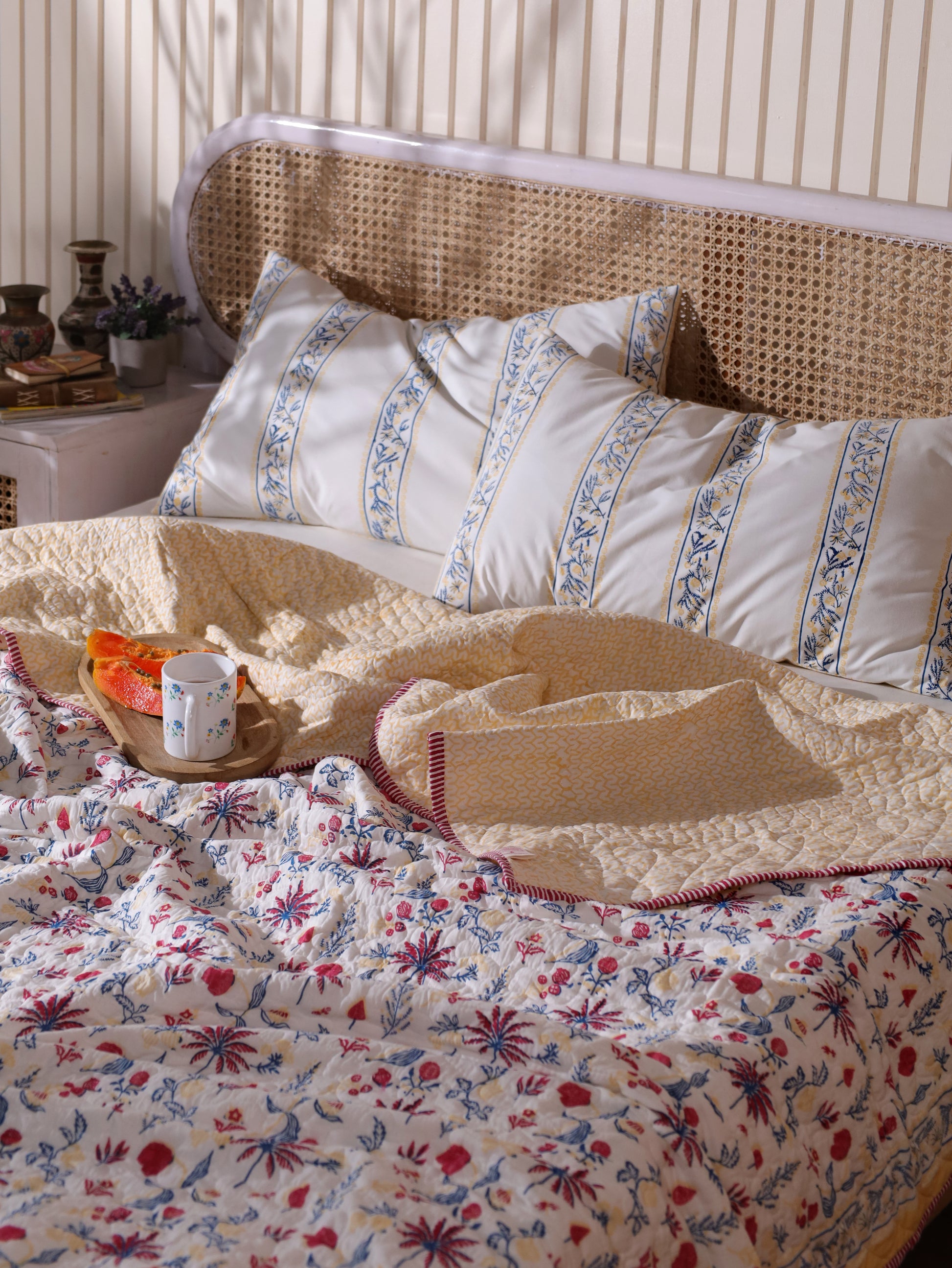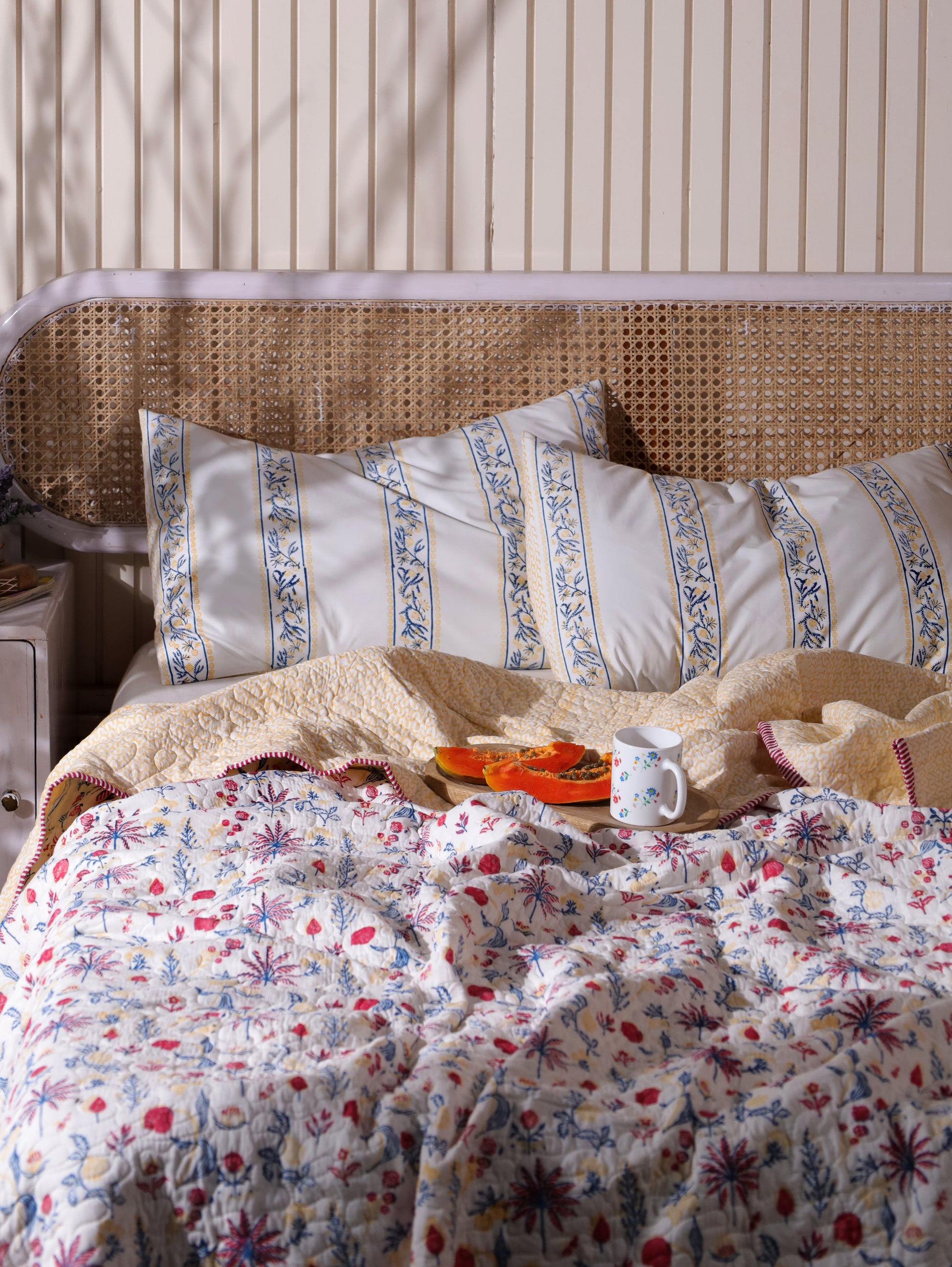 Magenta yellow and blue nariyal tree mulmul quilt (scattered floral)